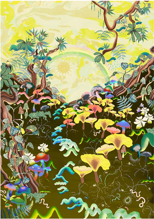 Munro’s latest series explores hyper-intelligent networks operating beneath the surface, looking closely at the role mycelium and soil health play in the survival of Earth. Drawn from observational studies and digitised into imagined environments. Living in the city, Munro’s connection to nature comes, in part, from the plants she nurtures in her home. Propagating and growing plants has long inspired her work, as has the reciprocal relationship between human beings and the natural world, the individual and the collective.