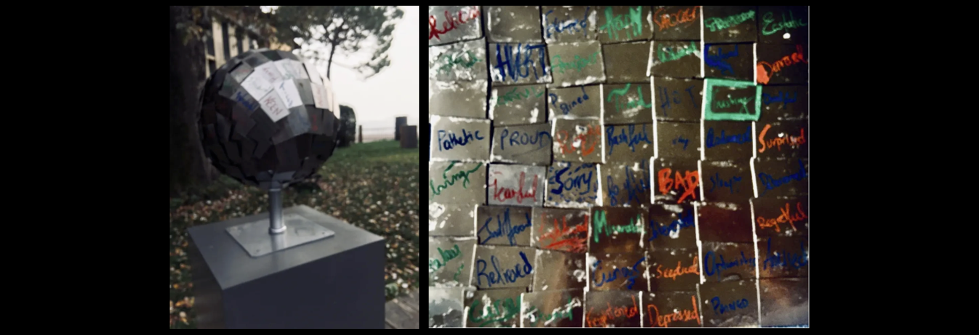 In groups of two or three, people talked about; their experience from the exhibition, their views on how they feel by observing an artwork, and what they admire in art, what they think about art, etc. At the same time, I asked questions regarding what colors they like, which symbols they value most, and the viewing experience in general. Then each individual had the choice to write how he or she felt after this interaction. The feelings were written down in small metal plates with the primary colors red, green and blue. Primary colors symbolises that with the main given, you can create a whole palette of different shades. The artwork is a metallic sphere, our earth and it consists of small mirror metal plates "canvases", where the viewers wrote on what they finally felt from the process of discussion with another participant. The small "canvases" were attached to the work with a magnet where the magnet symbolized the power of human unity and collectivity. Furthermore, the mirror effect is used as a reminder of self-acceptance and to create a balance. Listening to others but also yourself.