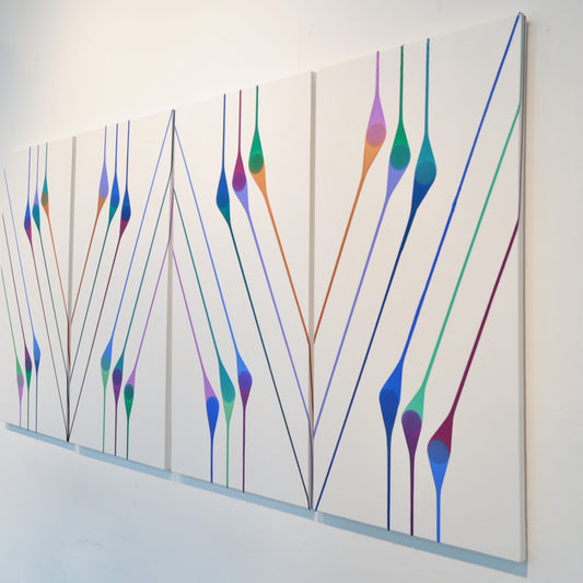 By pouring and manipulating paint on tilting structures, she creates a dialogue between art and science as the paint ebbs and flows in a single linear stroke under the force of gravity. Through this method of painting, she removes the artist from the gesture and emotion of painting, highlighting instead the complexity of colour and the intricacies of her materials. She has also created a series of installations and sculptures that explore colour, composition and form.