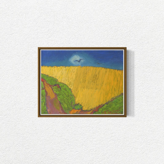Painting on both board and canvas, he seeks to capture this resilience and the timeless values essential to human survival. His pieces reflect the organic, raw textures of the land, incorporating elements that evoke the fertile and enduring quality of wheat fields. This texture reflects a tension he feels deeply as someone who lived through the Kosovo war. Witnessing such destruction impressed upon him the precariousness of life and the enduring spirit of those who survive amidst upheaval. His art is an homage to that spirit and an exploration of the core values—resilience, endurance, and strength—that guide people in times of turmoil. His work is also inspired by mythology, which offers symbols and stories that have helped people endure and overcome suffering. He is drawn to how mythological figures often embody the strength, patience, and hope needed to survive in difficult times. In his art, he blends these mythological images with depictions of nature, particularly wheat, to remind viewers of the power found in both collective history and the natural world. In his practice, each brushstroke is a reflection on survival, resilience, and the tenacity of human life. Through these paintings, he hopes to create a space where viewers can connect with the foundational elements of survival and find a sense of strength and continuity in the imagery of nature, mythology.